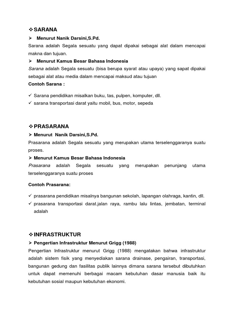 Bentuk dari sarana dan prasarana. Kebarangkalian kandungan mungkin berbeza daripada maksud sebenar tidak dapat dielakkan. Sarana dan prasarana merupakan segala alat dan bahan sesuatu yang bisa dipakai guna untuk mencapai ataupun menunjang tujuan dari sebuah proses produksi atau kegiatan lainnya. Contextual translation of maksud prasarana into english. Pedoman penjaminan mutu akademik universitas indonesia.